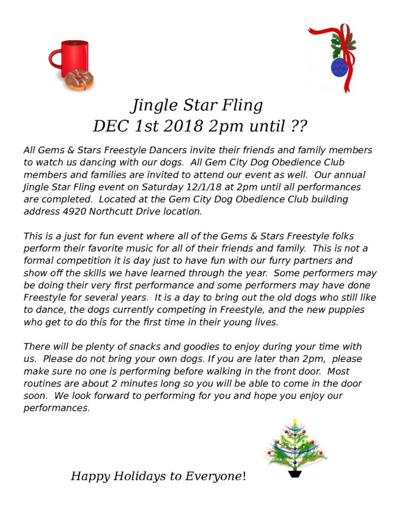All Gems & Stars Freestyle Dancers invite their friends and family members to watch us dancing with our dogs. All Gem City Dog Obedience Club members and families are invited to attend our event as well. Our annual Jingle Star Fling event on Saturday 12/1/18 at 2pm until all performances are completed. Located at the Gem City Dog Obedience Club building address 4920 Northcutt Drive location.